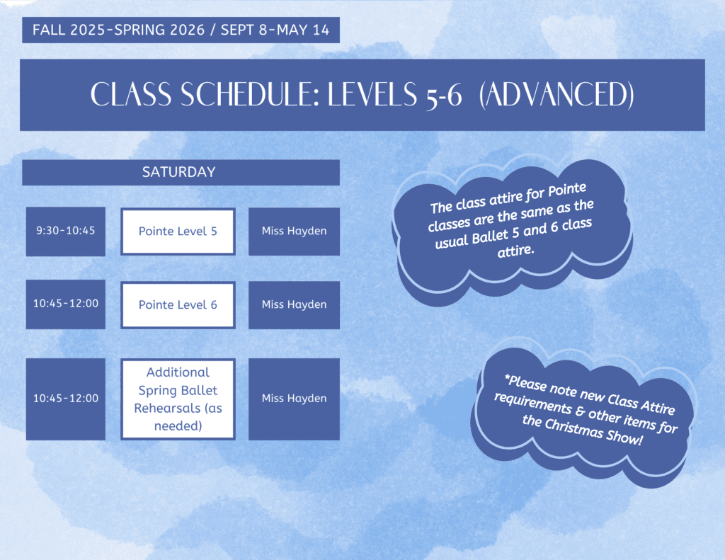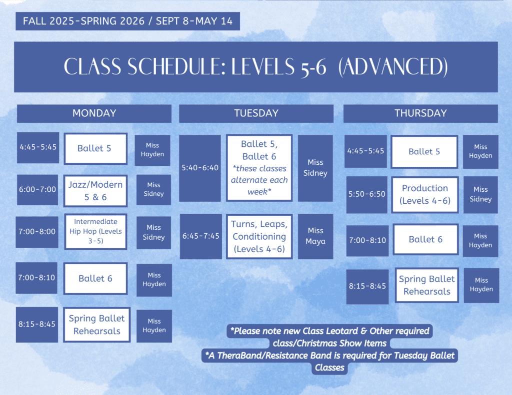 - Level 6: Advanced level for ages 13-Teen. Dancers in level 6 consistently show they understand and can perform correct technique. Dancers learn complex/advanced steps and combinations and can execute these combinations without sacrificing technique, control, and artistry.